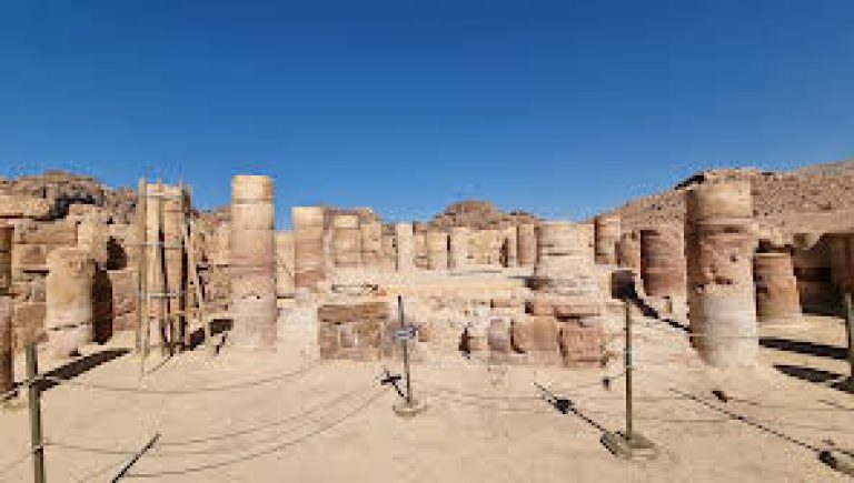 Atargatis, anche se alcuni studiosi ipotizzano che vi si adorasse anche la dea Al-Uzza. Il monumento è di stile nabateo; è preceduto da due grandi cortili disposti su piani diversi. Il più basso circondato da un colonnato, comprende un ampio portico, il cui accesso avviene attraverso una grande porta. Le pareti a base quadrata presentano alcune semi-colonne che incorniciano delle nicchie profonde. Davanti ai muri laterali, una serie di cinque colonne libere, determinano due navate. Al centro, una sorta di altare sopraelevato, è circondato da 12 colonne alla maniera di un peristilio; vi si accede attraverso due piccole gradinate, ad esso vicine; l’altare aveva degli spazi per contenere i paramenti sacri. Il pavimento del tempio e la parte inferiore delle pareti esterne sono rivestite in marmo, mentre le parti superiori delle colonne e il soffitto erano coperti di stucco dipinto. Alcune volute mostrano dei leoni alati , anziche` i tradizionali elementi decorativi dello stile corinzio, da questo particolare e` derivato il nome del monumento.
